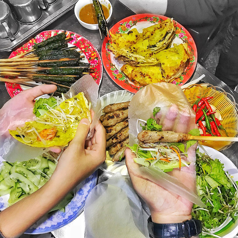 Banh xeo and nem lui are two dishes that anyone traveling to Da Nang must try at least once. Golden, crispy banh xeo on the outside, soft and moist on the inside combined with fragrant grilled nem lui create an irresistible dish. In particular, the rich, peanut-flavored dipping sauce also contributes to the deliciousness of this dish.